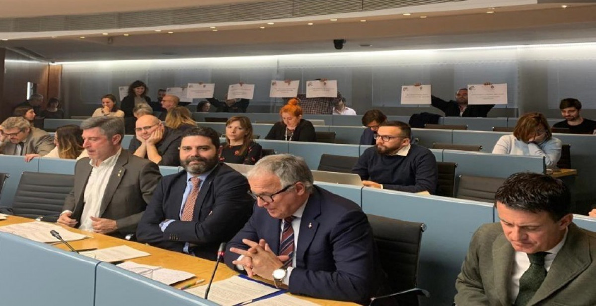 Representantes de la Central Sindical Independiente y de Funcionarios (CSIF) han irrumpido este miércoles con carteles reivindicativos en la Comisión de Presidencia, Derechos de Ciudadanía, Participación y Seguridad del Ayuntamiento de Barcelona para protestar por las condiciones laborales de la Guardia Urbana de Barcelona (GUB).
