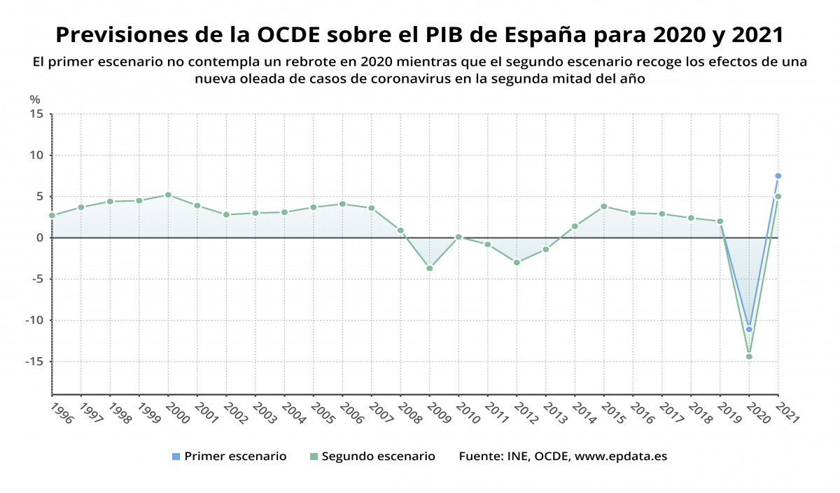 La OCDE ha decidido en esta ocasión presentar dos posibles escenarios. El primero contempla que no habrá un segundo rebrote del Covid-19 en 2020, por lo que el PIB de España se contraerá un 11,1% este año y experimentará un repunte del 7,5% durante 2021.
