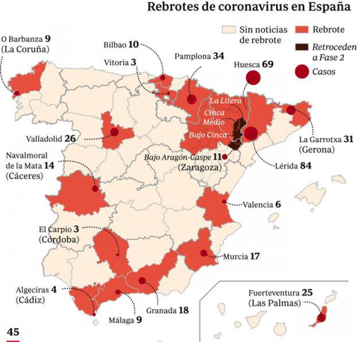 Aragón, con cuatro comarcas de vuelta a la fase 2, encabezó el ránking con 45 positivos, seguida de Madrid con 25, Cataluña con 15 y Navarra con 13. Con estas cifras, el número total de enfermos diagnosticados en España alcanzó las 246.752 personas, una cantidad de contagiados que en el mundo solo superan siete países: Estados Unidos, Brasil, Rusia, India, Reino Unido, Perú y, desde hoy mismo, Chile.
