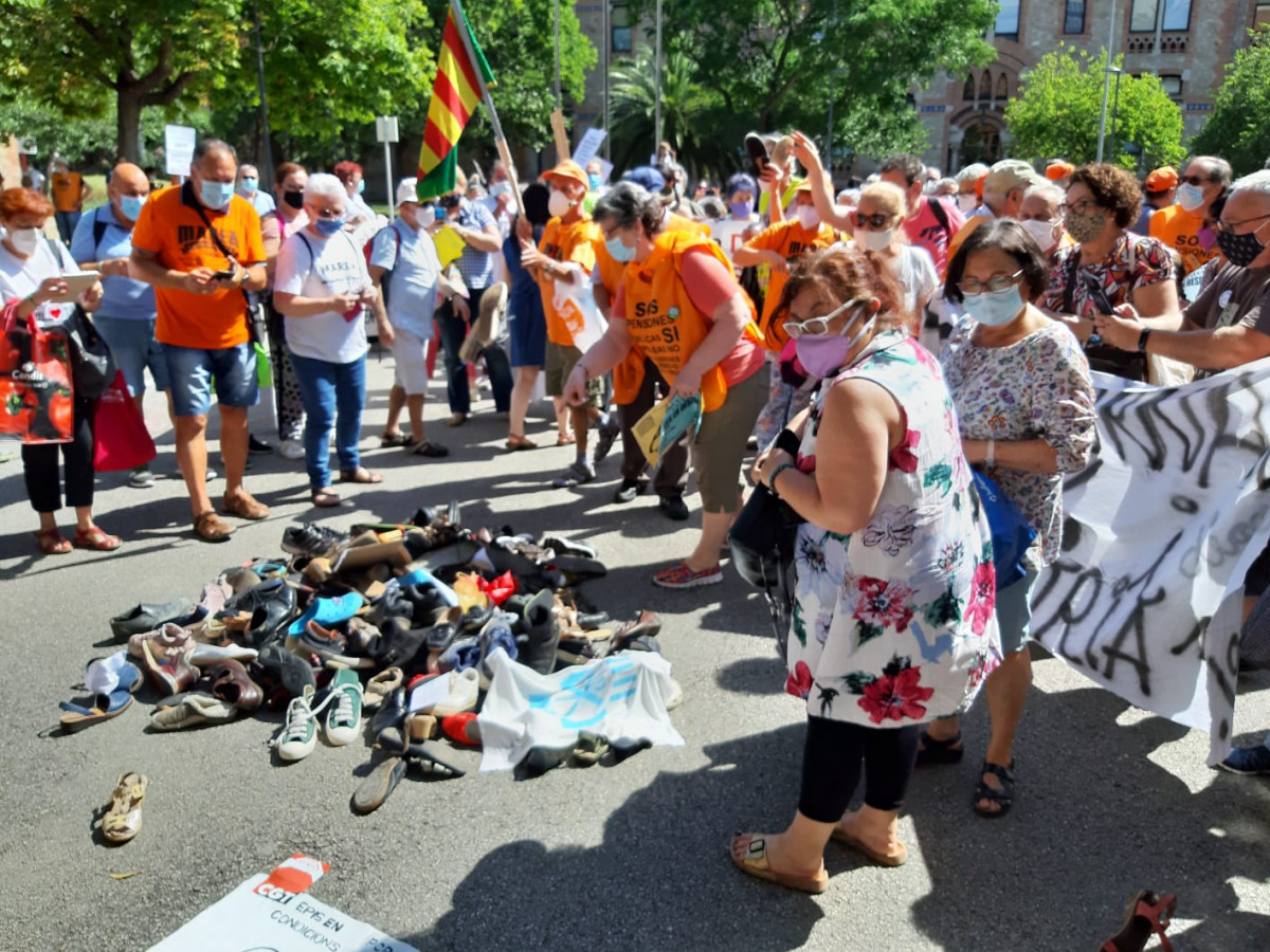 Los concentrados han amontonado decenas de zapatos en la puerta del edificio del Departament de Salut como recuerdo a los fallecidos durante la pandemia.
