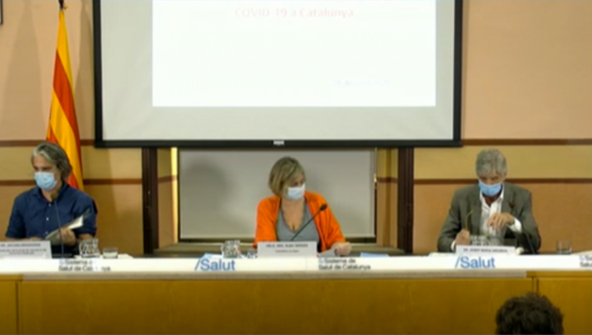 La consejera de Salut, Alba Vergés, el secretario de Salud Pública, José Maria Argimon, y el director de la nueva Unidad de Seguimiento de la Covid-19 en Catalunya, Jacobo Mendioroz, han presentado este martes las líneas estratégicas del Plan de Control de la Transmisión de la Covid-19 en Catalunya.
