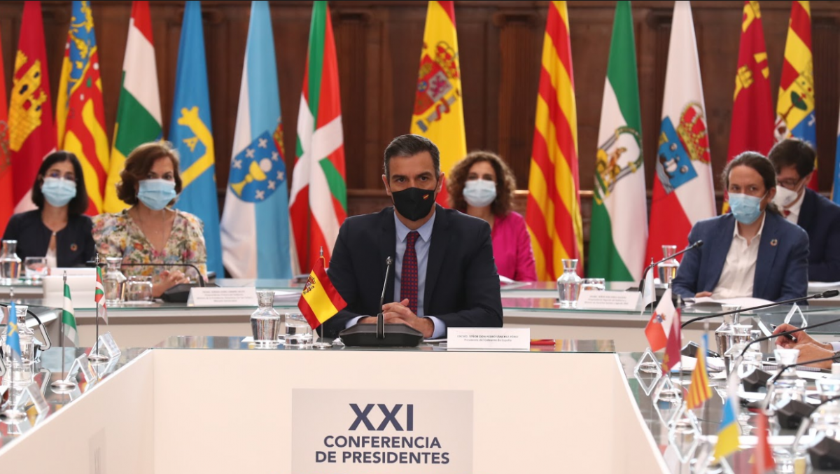El presidente del Gobierno, Pedro Sánchez, ha informado este viernes a los líderes autonómicos durante la Conferencia de Presidentes de que en primavera de 2021 se podría empezar a recibir prefinanciación por el 10% de los fondos fruto del Acuerdo de Recuperación Económica alcanzado en la Unión Europea.