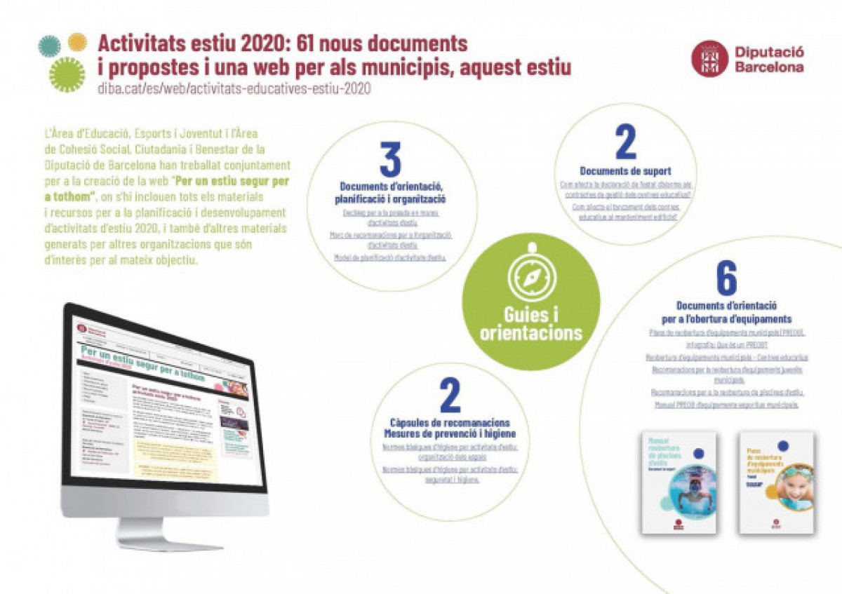 La Diputación de Barcelona, con la voluntad de continuar garantizando la organización este verano de actividades de ocio seguras, ha editado dos infografías bajo el título 61 nuevos documentos y propuestas y una web para los municipios, este verano que recogen de una manera visual y rápida todo el trabajo de apoyo a la planificación y gestión de las actividades de verano 2020 que se ha estado haciendo hasta ahora desde la corporación, a través de las áreas de Educación, Deportes, Juventud y Cohesión Social, Ciudadanía y Bienestar.