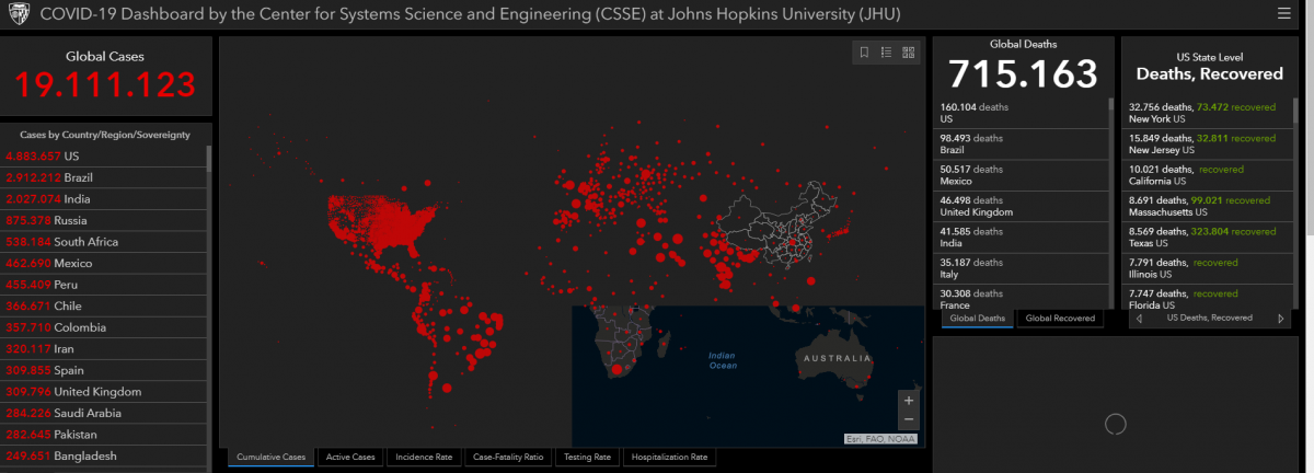 El número de casos de coronavirus en todo el mundo ha superado ya los 19 millones (19.091.446) y un total de 714.767 personas han muerto hasta el momento por coronavirus en todo el mundo, según el recuento de la Universidad Johns Hopkin, de ellos 160.104 en Estados Unidos, 98.493 en Brasil y 50.517 en México.