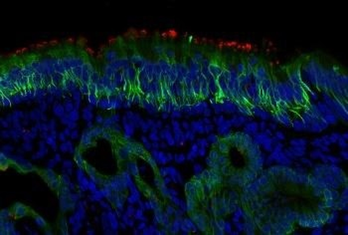 Los científicos utilizaron una técnica de diagnóstico por imágenes de alta resolución llamada microscopía confocal para producir imágenes muy nítidas de las células que recubren las vías respiratorias nasales y traqueales. Utilizaron manchas fluorescentes para identificar los receptores ACE2.