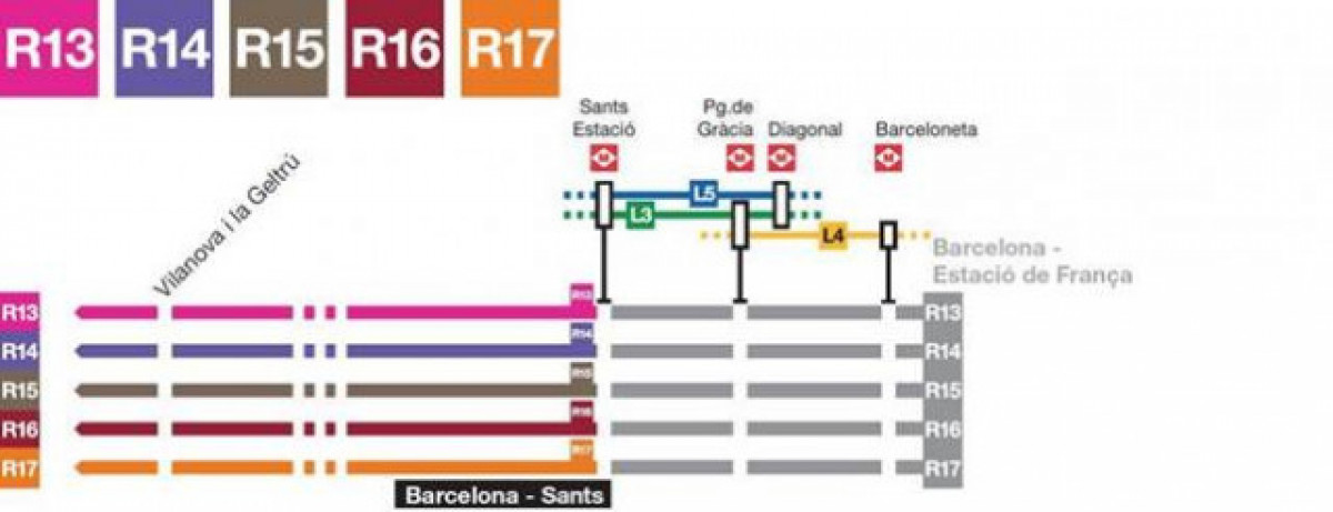 Los trenes regionales de las líneas R13, R14, R15, R16 y R17 tendrán como origen y final Sants, sin parada en Paseo de Gracia ni en la Estació de França, donde los viajeros podran llegar con las líneas L3, L4 y L5 de Metro