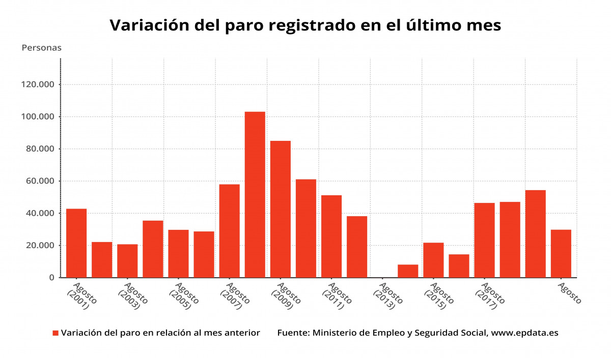 y el fin de la temporada turística de un verano marcado por el Covid-19 finalizan muchos contratos vinculados a la estación veraniega por lo que agosto es tradicionalmente un mal mes para el empleo. En todos los meses de agosto desde 2001 ha aumentado el paro registrado, salvo en 2013, cuando se redujo en 31 personas.