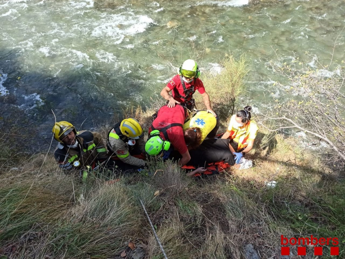 Los Bombers de la Generalitat la han rescatado con una grúa, y el Sem, que ha activado dos unidades, la ha trasladado al hospital en estado grave, aunque no se teme por su vida.