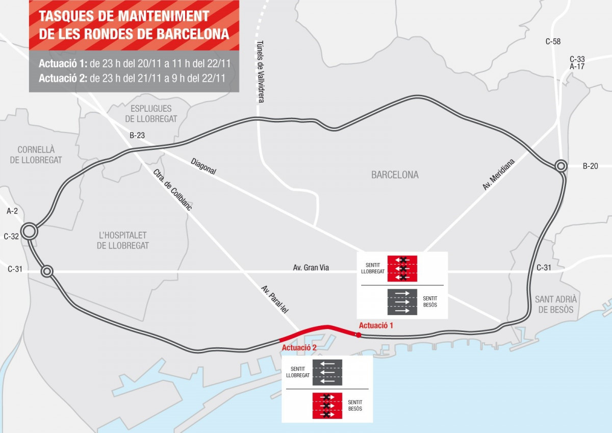 En sentido Llobregat, habrá cortes en la circulación desde la salida Barceloneta (número 22) hasta la incorporación a la salida Paral·lel (número 21) entre las 23 horas del viernes y las 11 del domingo, además de que la incorporación Barceloneta también quedará fuera de servicio.
