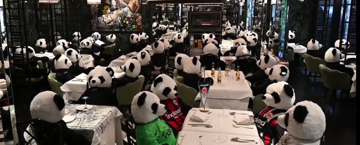 El propietario de un restaurante de Frankfurt está organizando una protesta contra el cierre del coronavirus en Alemania al llenar sus mesas con cien pandas de peluche, en un juego de palabras con la palabra "pandemia".