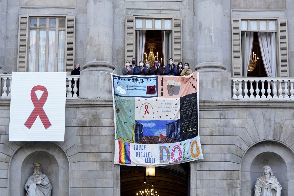 Barcelona homenajea a las víctimas de sida con un tapiz memorial en la fachada del Ayuntamiento