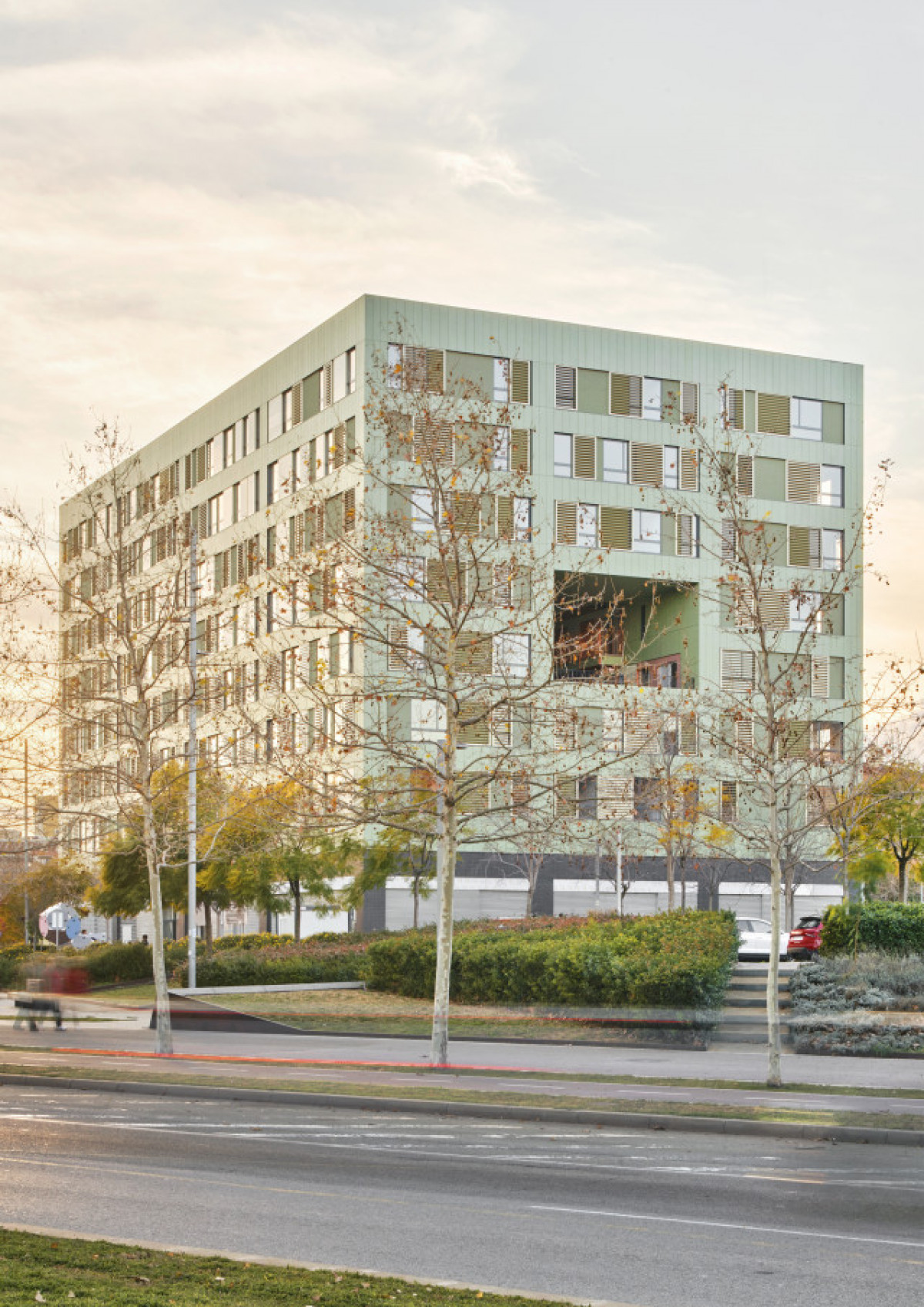 El edificio se ha pensado en unidades de tres vecinos con balcones interiores que permitirá potenciar las relaciones entre el vecindario como comunidad y con su entorno. Así se favorece la vida comunitaria en una localización que cuenta con un puñado de servicios a su alrededor: un CAP, transporte público y acceso a un parque donde se ubica el edificio. Se ha tenido especial cuidado en la insonorización entre viviendas.
