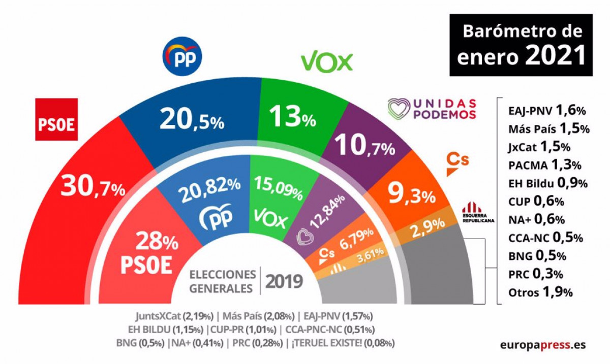 La encuesta, realizada en plena tercera ola del coronavirus, coloca a los socialistas con 10,2 puntos por delante del PP, que en enero se anota un porcentaje de voto del 20,5%. Por contra, tanto Unidas Podemos como Vox y Ciudadanos empeoran sus registros de diciembre.