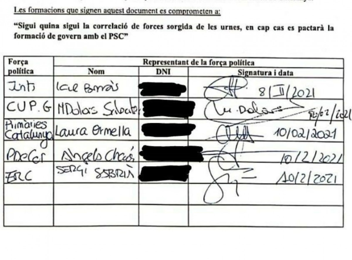"Sea cual sea la correlación de fuerzas surgida de las urnas, en ningún caso se pactará la formación de gobierno con el PSC", según el escrito difundido en Twitter por Catalans per la Independència (colectivo que lo ha impulsado) y han confirmado estos partidos.