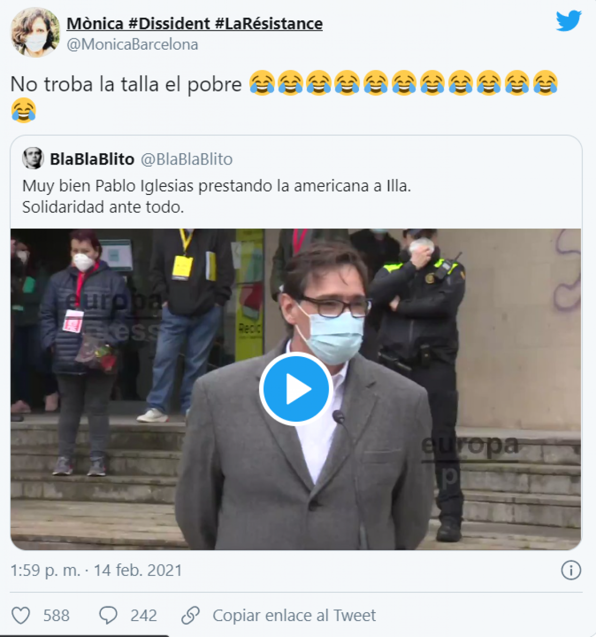 También ha aprovechado los mensajes de tuiteros independentistas para burlarse de Salvador Illa a cuenta de la chaqueta que el candidato del PSC llevaba puesta cuando iba a votar o para aplaudir, retuit mediante, a una mujer que aseguraba haber tenido una experiencia «orgásmica» tras haberse encontrado en un colegio electoral con la candidata de En Comú Podem, Jessica Albiach, y llamarla «a la cara» fascista.