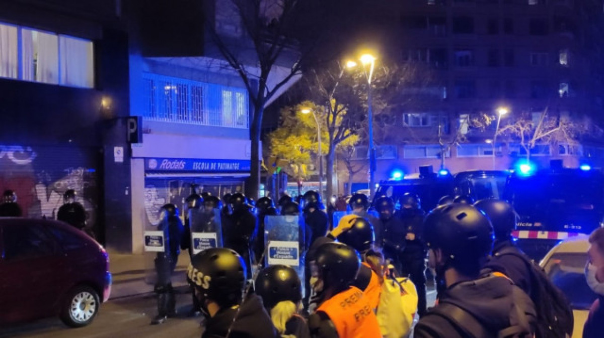 Pasadas las 20.00, tanto los primeros violentos como el espesor están en la ronda de San Pedro, desde donde los encapuchados que encabezan la marcha tiran las botellas a los Mossos situados a ambos lados de la calle, mientras los comercios comienzan a bajar sus persianas.