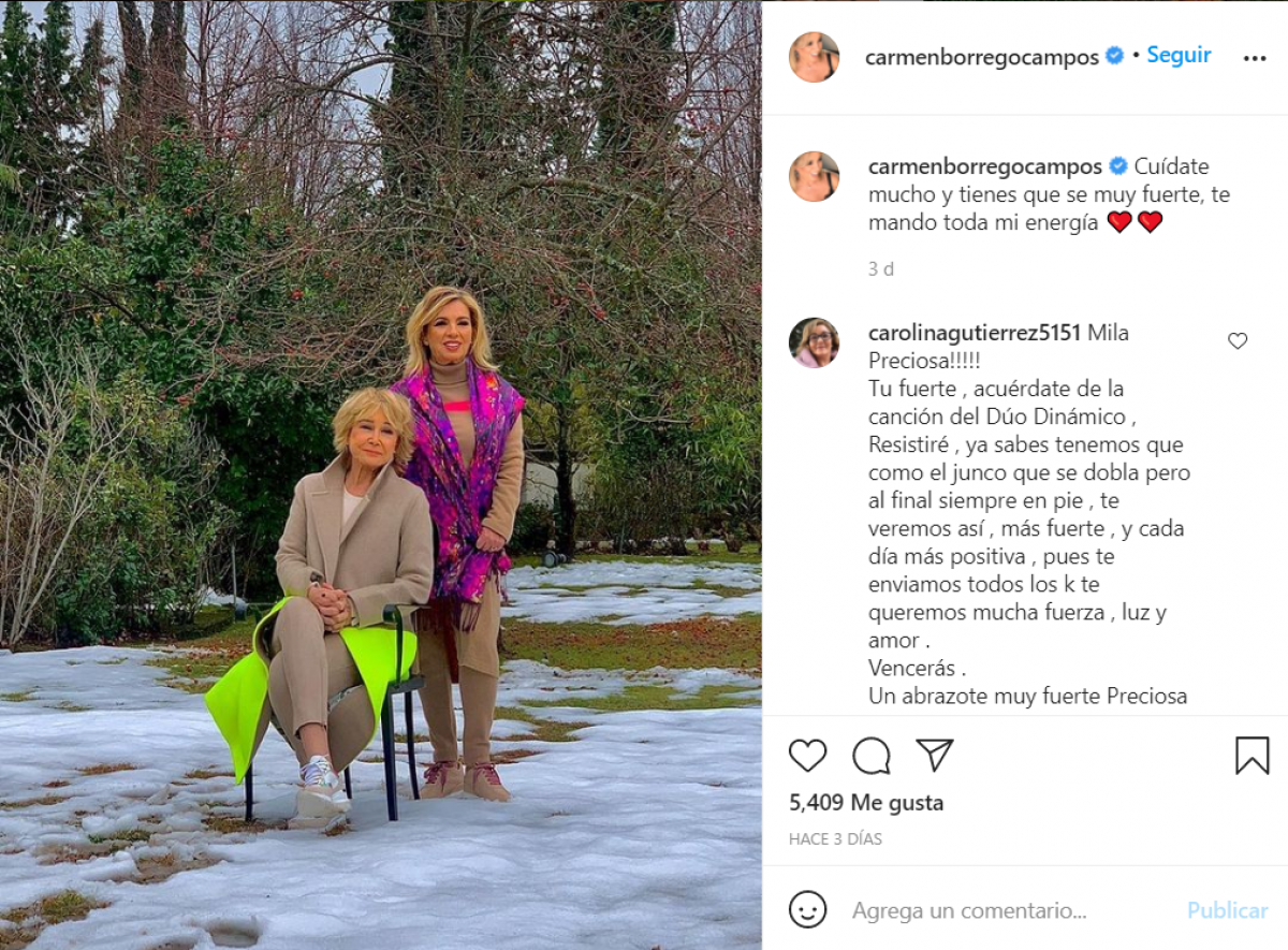 Durante estos días, Mila Ximénez ha recibido el apoyo por redes sociales de muchos colaboradores de televisión que además de ser compañeros, son amigos y quieren enviarle toda la fuerza a la periodista. Carmen Borrego era la primera que colgaba una fotografía con ella en su perfil de Instagram mandándole todo su apoyo, pero lo cierto es que horas más tarde, Belén Esteban, Antonio Rossi... se sumaban a esta oleada de comentarios para transmitirle los mejores deseos.