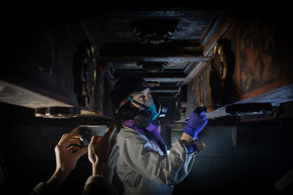 Así, en junio, un equipo de restauradores empezó a trabajar para recuperar completamente la pintura original de 14 metros cuadrados del techo de madera del patio de la sede de la plaza Sant Jaume, que muestra el primer escudo pintado de Barcelona que se conoce.