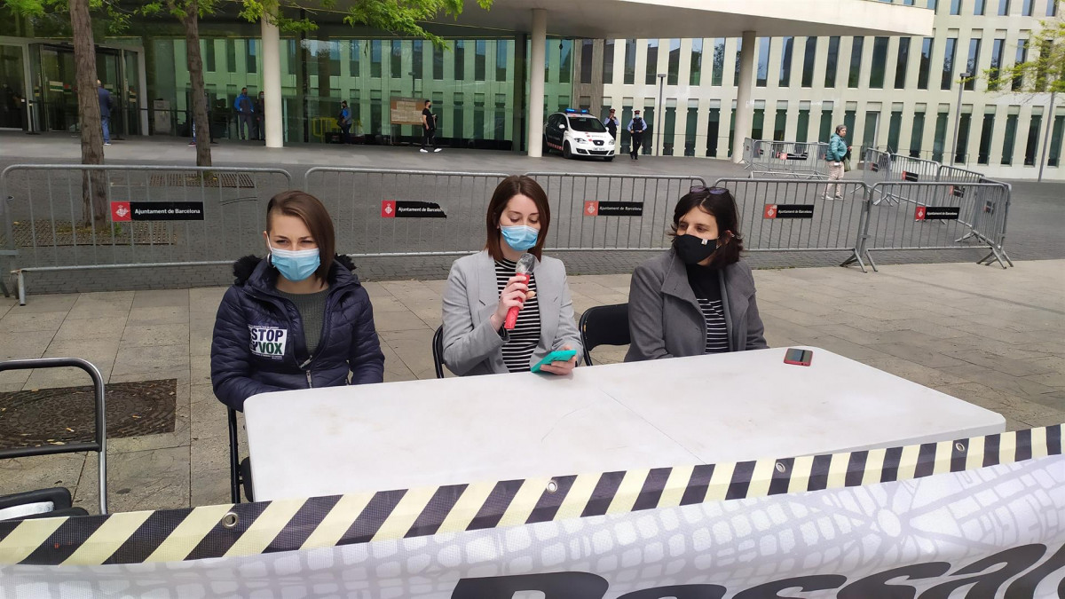 La activista de Unitat Contra el Feixisme i el Racisme (UCFR) y Solidaritat Perifèrica Marina Morante; la denunciante, Vicky; y su abogada, Júlia Humet; ante la Ciutat de la Justicia de Barcelona, el 22 de abril de 2021 (EP)