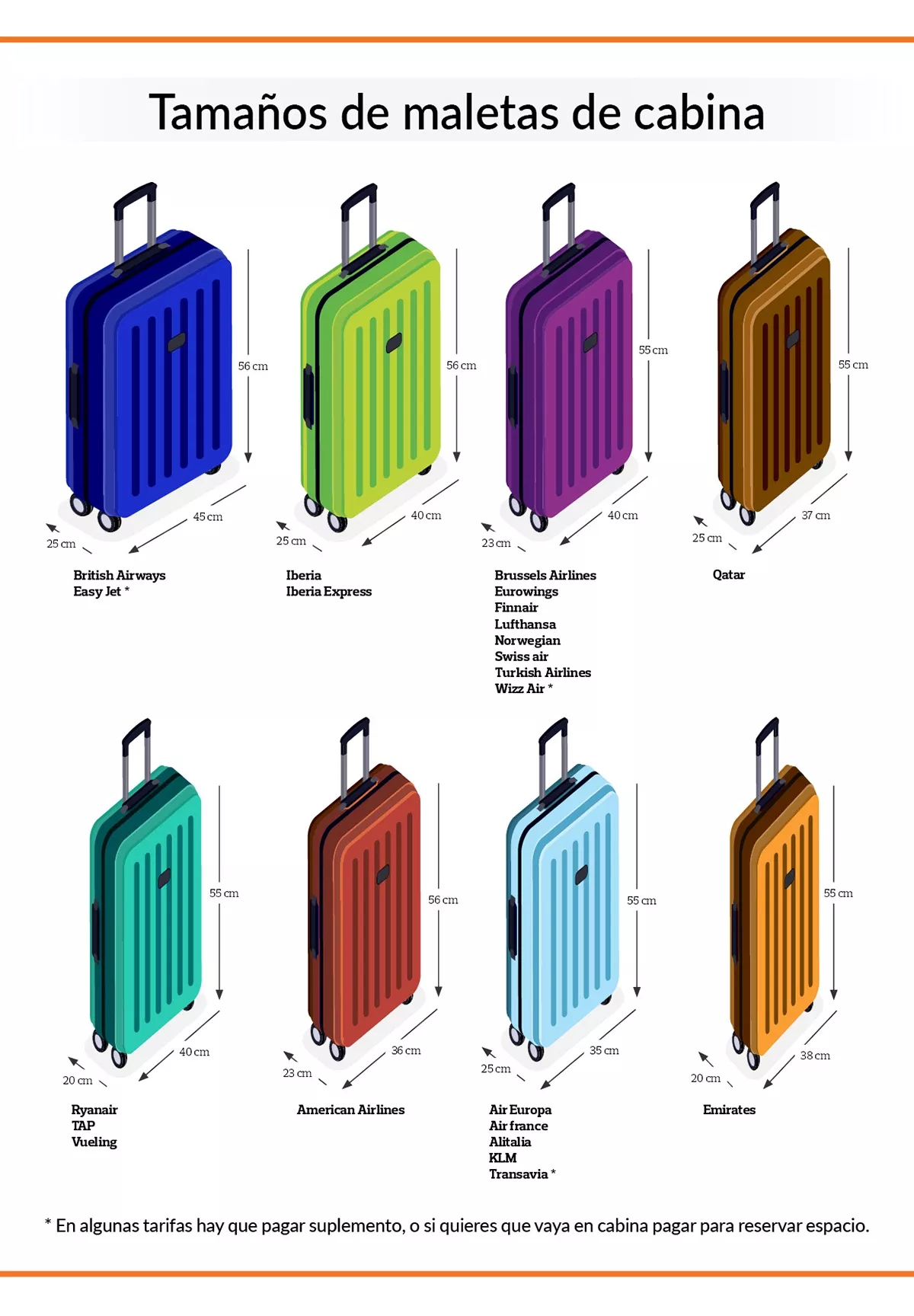 En general, las compañías son ligeramente más generosas con las dimensiones, aunque está bien saber que si tu maleta mide 55 x 35 x 20 la admitirán en todas las compañías. Este es el tamaño del equipaje de mano admitido en cabina en las principales compañías.