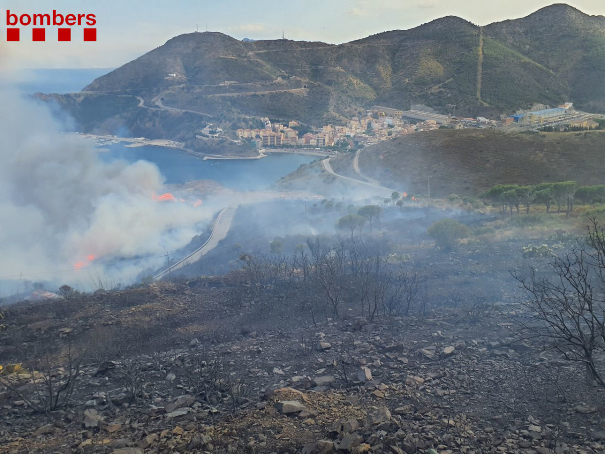 Los Bomberos de la Generalitat trabajan este sábado por la tarde en un incendio de vegetación en Portbou (Girona) que ha entrado desde el Coll dels Belitres, en la llamada 'Catalunya Nord'.