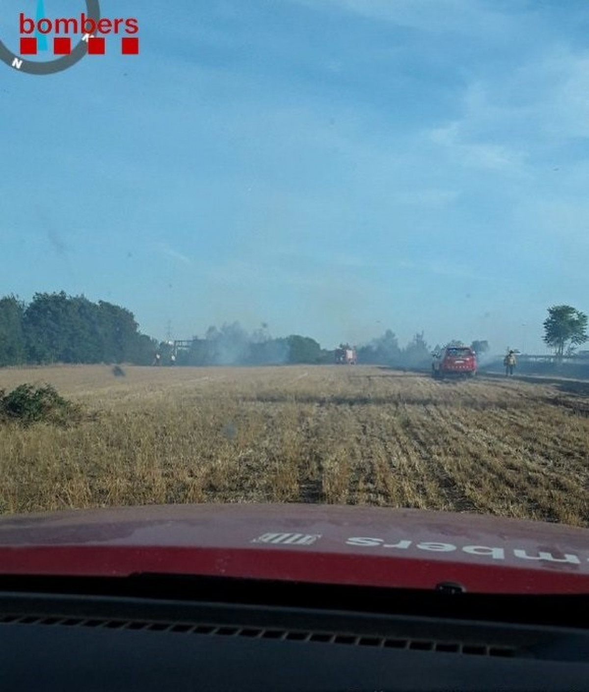 Los Bombers trabajan en un incendio en un campo segado en Girona