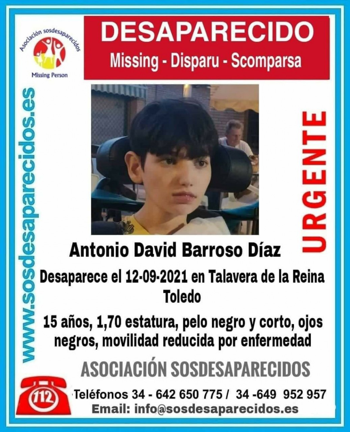 Las Fuerzas y Cuerpos de Seguridad del Estado buscan actualmente a un menor de 13 años de edad vecino de Morón de la Frontera (Sevilla) y que sufre una discapacidad física, después de que su madre saliese de viaje llevándole consigo y fuese localizada en la provincia de Segovia "desorientada", dando explicaciones "inconexas". La mujer ha manifestado haber matado supuestamente al chico en Madrid y haberse deshecho del cadáver, relato cuya veracidad o no aún está pendiente de esclarecer.