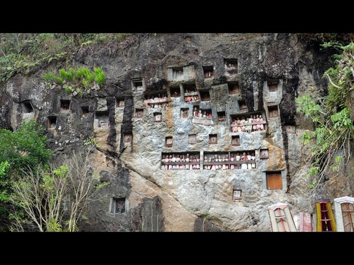 Durante el tiempo que el difunto permanece en casa, los torajas también preparan el lugar que albergará su cuerpo después del funeral. El descanso eterno no será bajo tierra, sino en cuevas hechas en las rocas, que no se cerrarán a cal y canto, en pequeños tongkonans (forma típica de las viviendas torajas) o en ataúdes suspendidos en paredes de granito. Los difuntos compartirán ese espacio con figuras de madera, “tau tau”, que procurarán que se parezcan lo más posible al fallecido y permanecerán visibles en balcones y huecos delante de sus tumbas. Los tau tau pueden ser más o menos grandes y mejor acabados en función del artesano y del precio. Estas sepulturas, balcones y figuras, pueden verse en varios lugares de la región de Tana Toraja, siendo las más conocidas y visitadas las de Lemo, Londa o las de Tampang Allo, a las que se puede llegar fácilmente desde la localidad de Rantepao. Se pude contratar un guía todo el día por unos cincuenta euros o alquilar una moto. Dependiendo del tiempo que se disponga lo recomendable es un guía, ya que están al corriente de dónde se celebran funerales y saben muy bien cómo llegar a los lugares mencionados. Por otro lado, viajar en moto te permite explorar, visitar más lugares, permanecer en ellos el tiempo que quieras y sale mucho más barato.