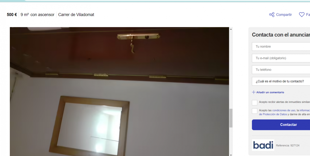 Se trata de un piso de 9 metros cuadrados - sí, a eso le llaman piso- por el que piden 500 euros. Está situado en la calle Viladomat, en l'Esquerra de l'Eixample.