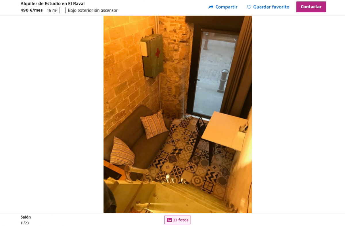 Se trata de un estudio en el Raval con solo 16 metros cuadrados - o 15 metros cuadrados, depende la parte del anuncio que mires- y se oferta en una web de alquiler de pisos, como es Idealista, sin tener cédula de habitabilidad. Pero claro, para que la necesitan siendo un "moderno estudio".