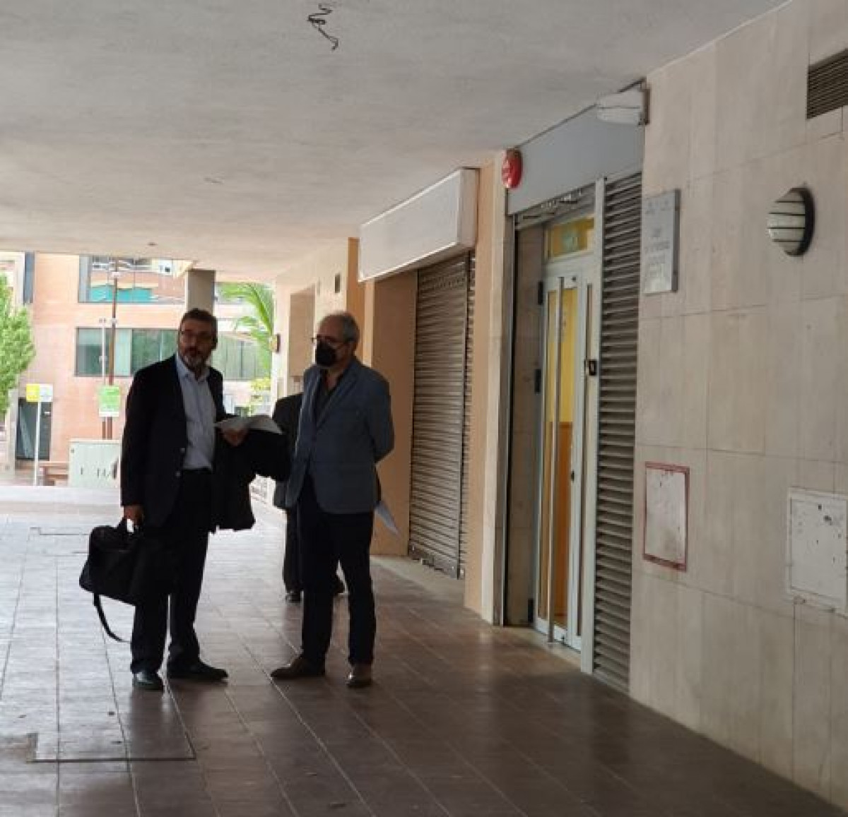 El ex secretario y el abogado del Ayuntamiento entrando en el Juzgado número 8 de Gavà/ @Vilapress