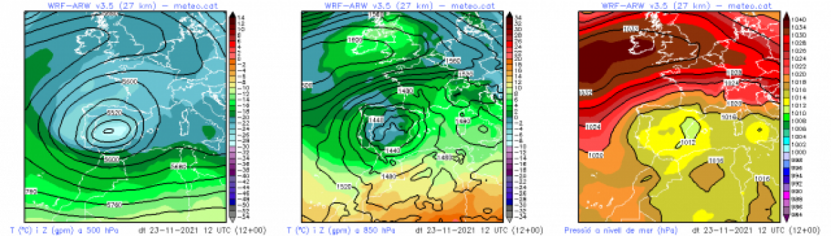 Los mapas anteriores muestran la situación del martes 23 de noviembre a mediodía. A la izquierda, la topografía de 500 hPa (unos 5.500 m de altitud) muestra la DANA centrada sobre la Península Ibérica. En el centro, la topografía de 850 hPa (unos 1.500 m de altitud) muestra el viento de sudeste incidiendo sobre el litoral catalán y aportando aire relativamente templado (alrededor de +4 ºC a este nivel) en comparación con el aire más frío del centro de la península. En superficie (a la derecha), un potente anticiclón en el oeste de las Islas Británicas y bajas presiones en el Mediterráneo provocaban viento de levante en el litoral catalán, aportando humedad.