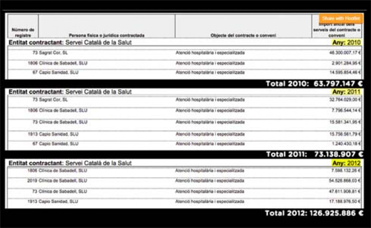 El sindicato extrae estos datos de los publicados por el "Registro de convenios y contratos en el ámbito de la asistencia sanitaria pública" del Departamento de Salud de la Generalitat de Catalunya y con ellos en la mano denuncia que la sanidad esta siendo "concebida como un negocio" desde la Generalitat "compensando la bajada de facturación de la sanidad privada con la destrucción de la sanidad pública".