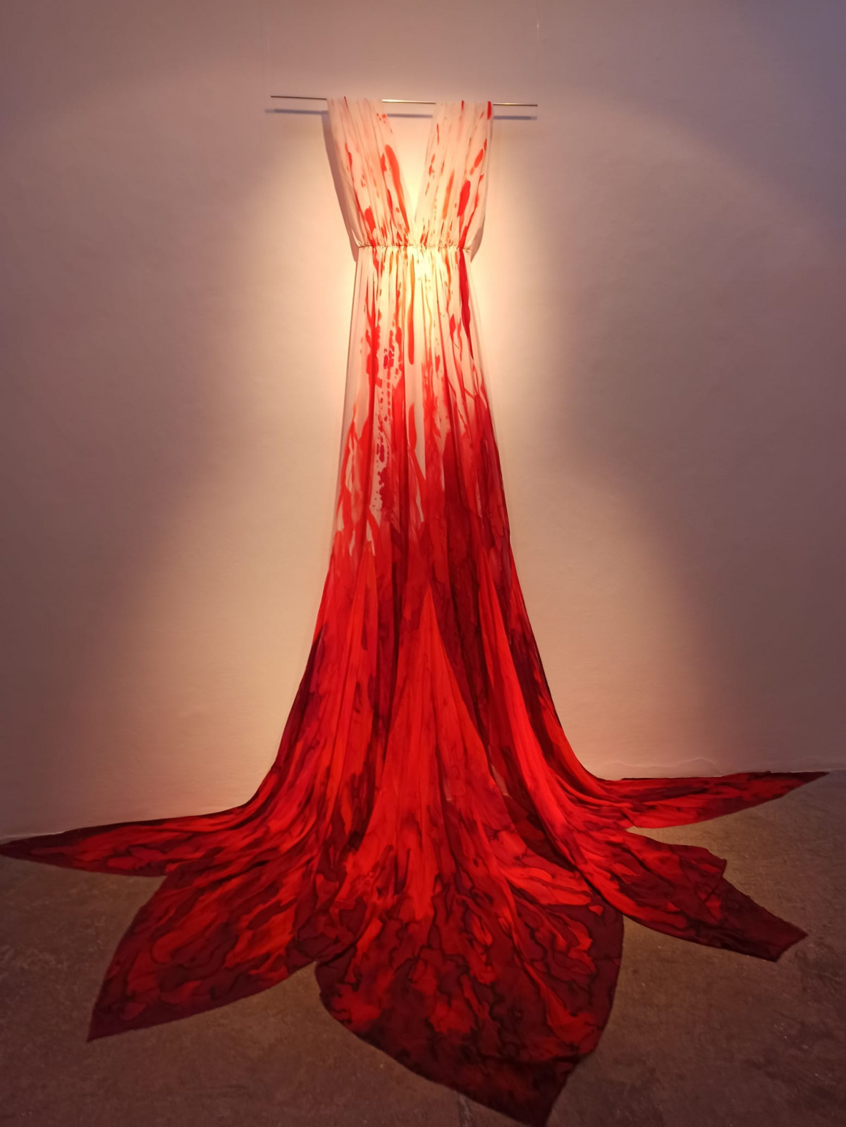 Hay también otra obra de gran tamaño, “Casandra, el origen”, una seda mural de tres metros de largo por 75 centímetros de ancho, realizada en 2011 y perteneciente a la serie “Voladuras”, así como cuatro cubos de metacrilato que custodian en su interior sedas caligrafiadas con frases del libro de Wolf sobre Casandra y quince fotografías con imágenes de sedas pintadas con fragmentos de la túnica, drapeados, arrugados y manchados de sangre.