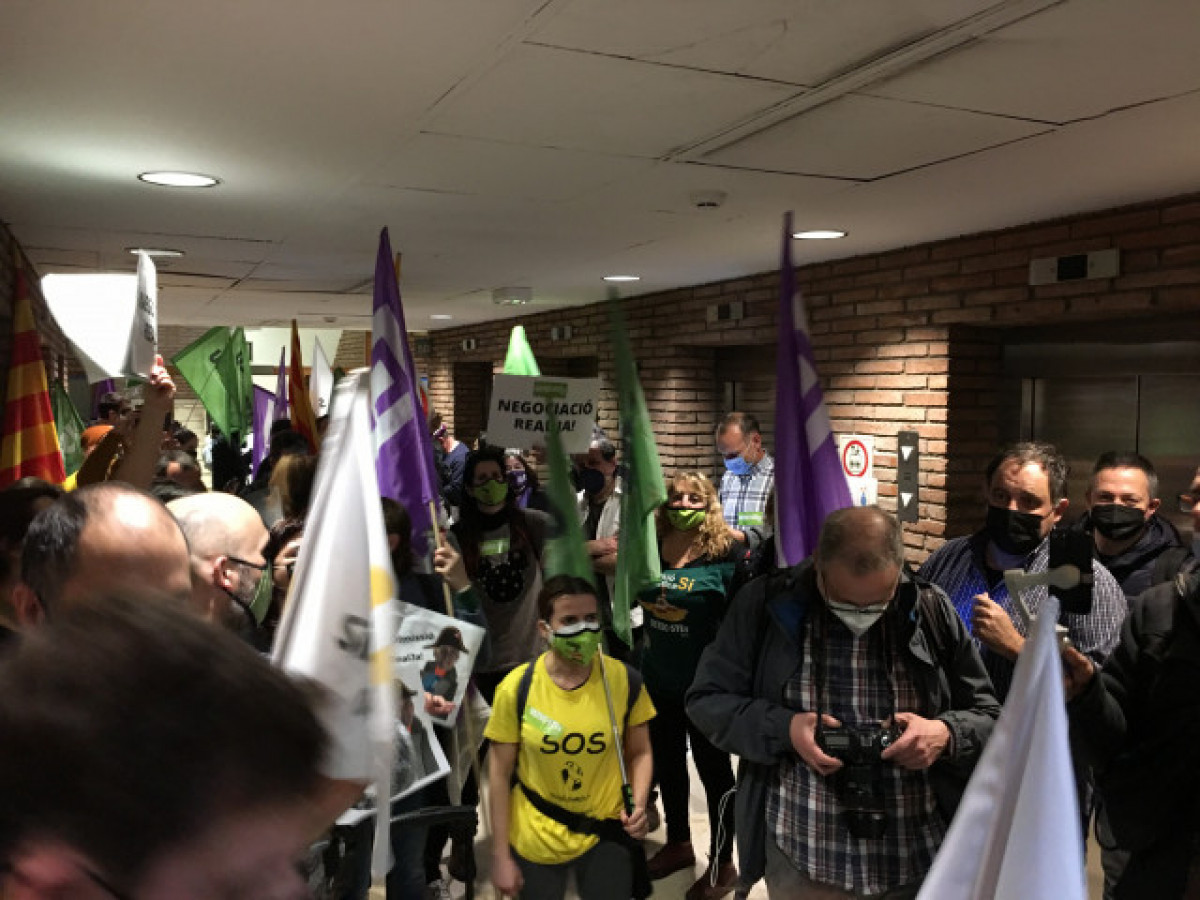 En un comunicado unitario este jueves, Ustec·Stes, CCOO , Intersindical-CSC , Aspepc·Sps y UGT han avisado de que no abandonarán el cierre en el edificio hasta que el conseller Josep González-Cambray " no dé la cara y venga a negociar ", y según fuentes sindicales esta hora quedan unas 50 personas en el interior del inmueble.