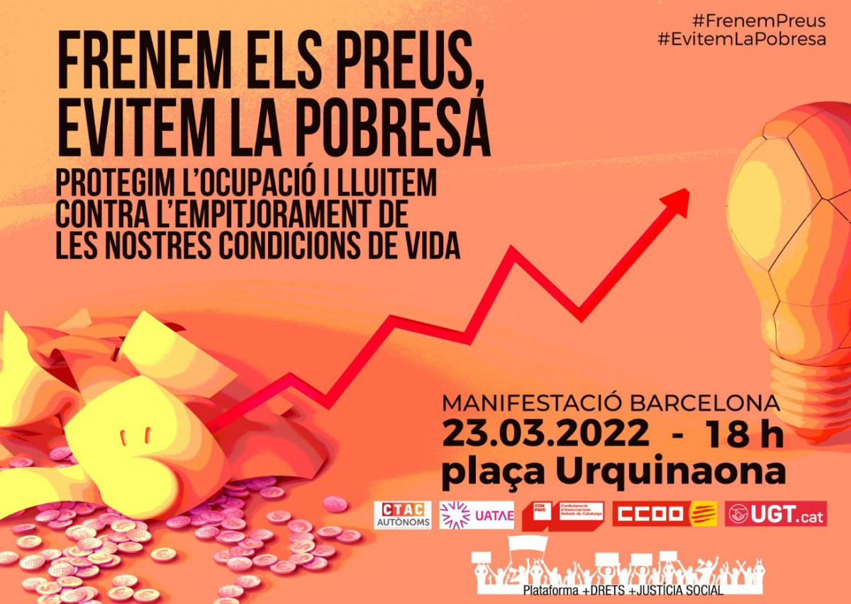 Por eso, CCOO, UGT, UPTA, Uatae, Facua y la Confederación Estatal de Asociaciones Vecinales (CEAV) ha convocado movilizaciones. En total, casi 60 concentraciones o manifestaciones en toda España que llevan por lema 'Contener los precios, proteger el empleo, frenar el deterioro de nuestras condiciones de vida". La de Barcelona en concreto será a las 18:00h en la plaza Urquinaona.