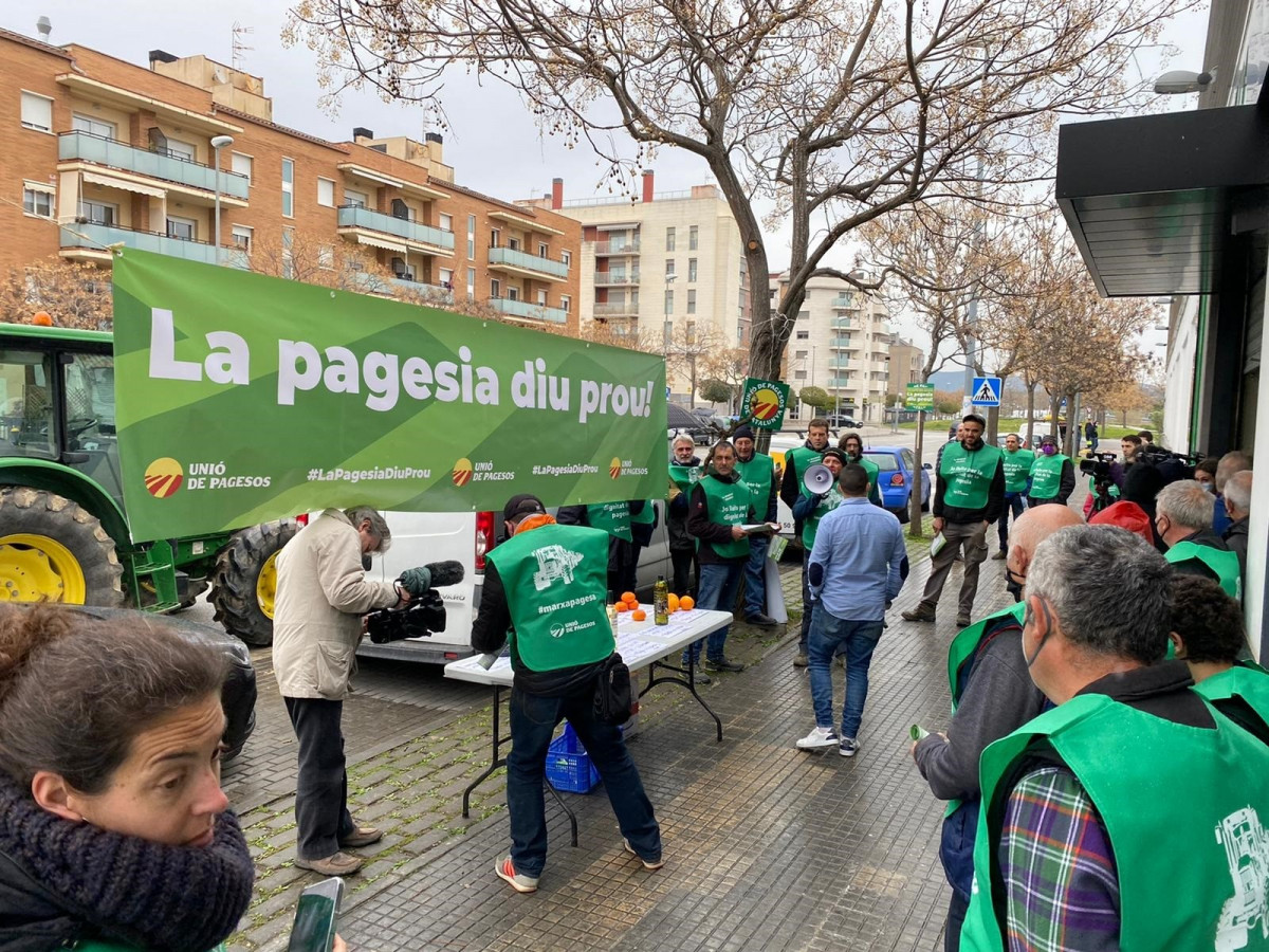 Miembros de Unió de Pagesos se han concentrado este sábado ante unos 20 supermercados de toda Catalunya para afearles que, junto a la gran industria, "provocan precios ruinosos" para el campo, y les han acusado de quedarse grandes beneficios, en sus palabras.