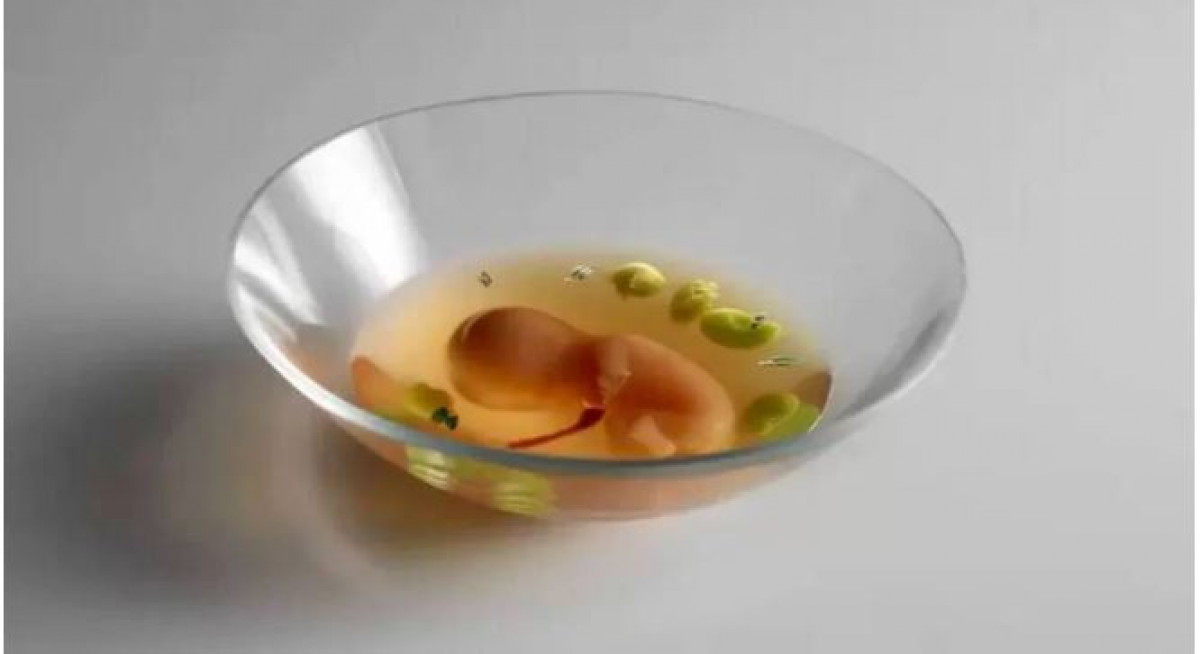 El parecido del feto comestible con un real es impresionante y está confeccionado para que parezca que realmente el comensal está mordiendo un embrión, ya que está hecho con un gel de habas con una almendra en la cabeza que cruje al morderla simulando el cráneo. Tal cual.