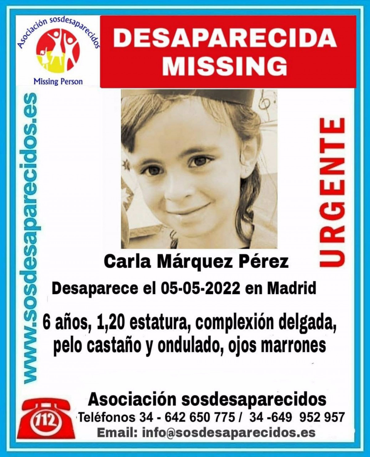 Ante esta situación, la próxima semana Juan Manuel viajará a Madrid a reunirse con su abogada mientras pide a las autoridades que se movilicen para encontrar a la pequeña. Además, se ha puesto en contacto la asociación SOS Desaparecidos, que esta tarde ha lanzado una alerta pública para buscar a Carla, una niña de 6 años, 1,20 metros de estatura, complexión delgada, pelo castaño y ondulado y ojos marrones.