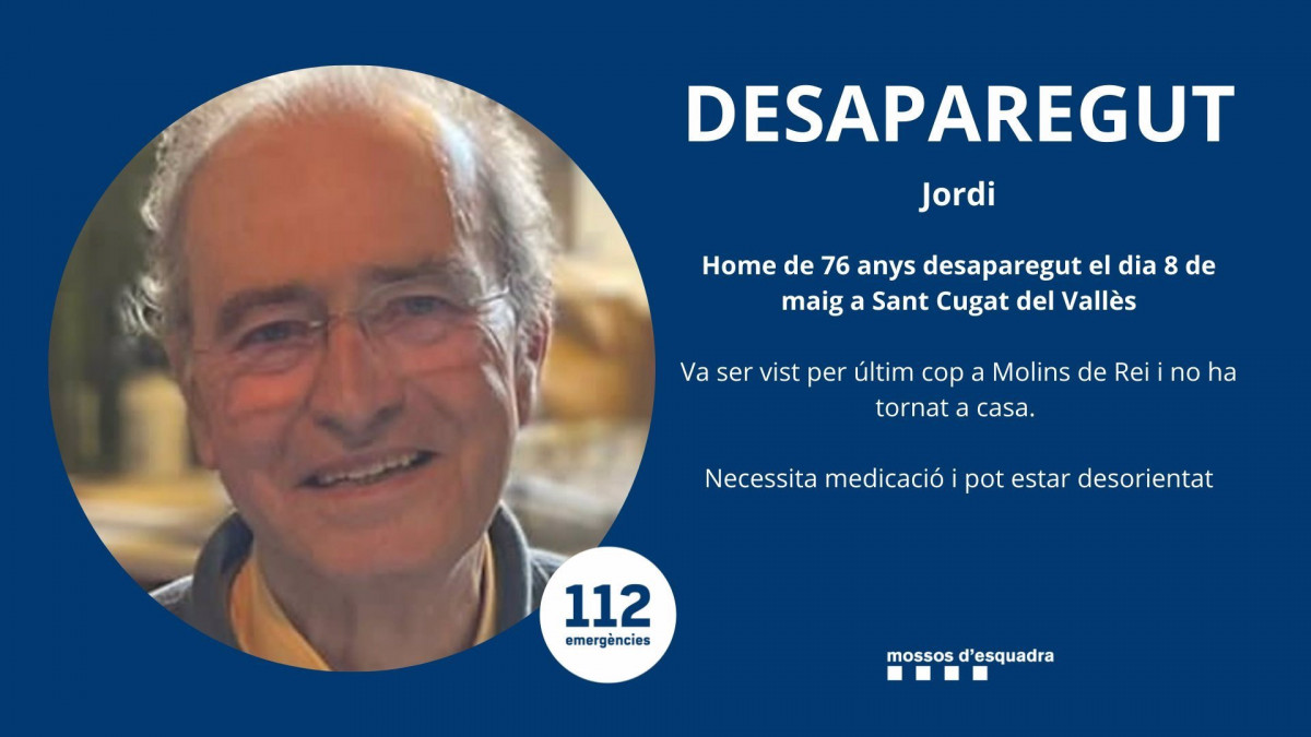 Los Mossos d'Esquadra han pedido ayuda ciudadana para encontrar a un hombre de 76 años desaparecido desde el domingo 8 de mayo, cuando fue visto por última vez en Molins de Rei (Barcelona).