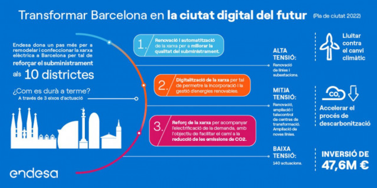 El Plan Ciudad -acordado entre Endesa y el Ayuntamiento de Barcelona en el marco de la mesa de trabajo creada el año pasado- tiene como objetivo mejorar la calidad del servicio mediante la construcción, renovación y el mantenimiento de las infraestructuras eléctricas de alta, media y baja tensión para acompañar a la capital catalana en su transformación y crecimiento, a la vez que hacer frente a los nuevos retos ya los nuevos usos energéticos.