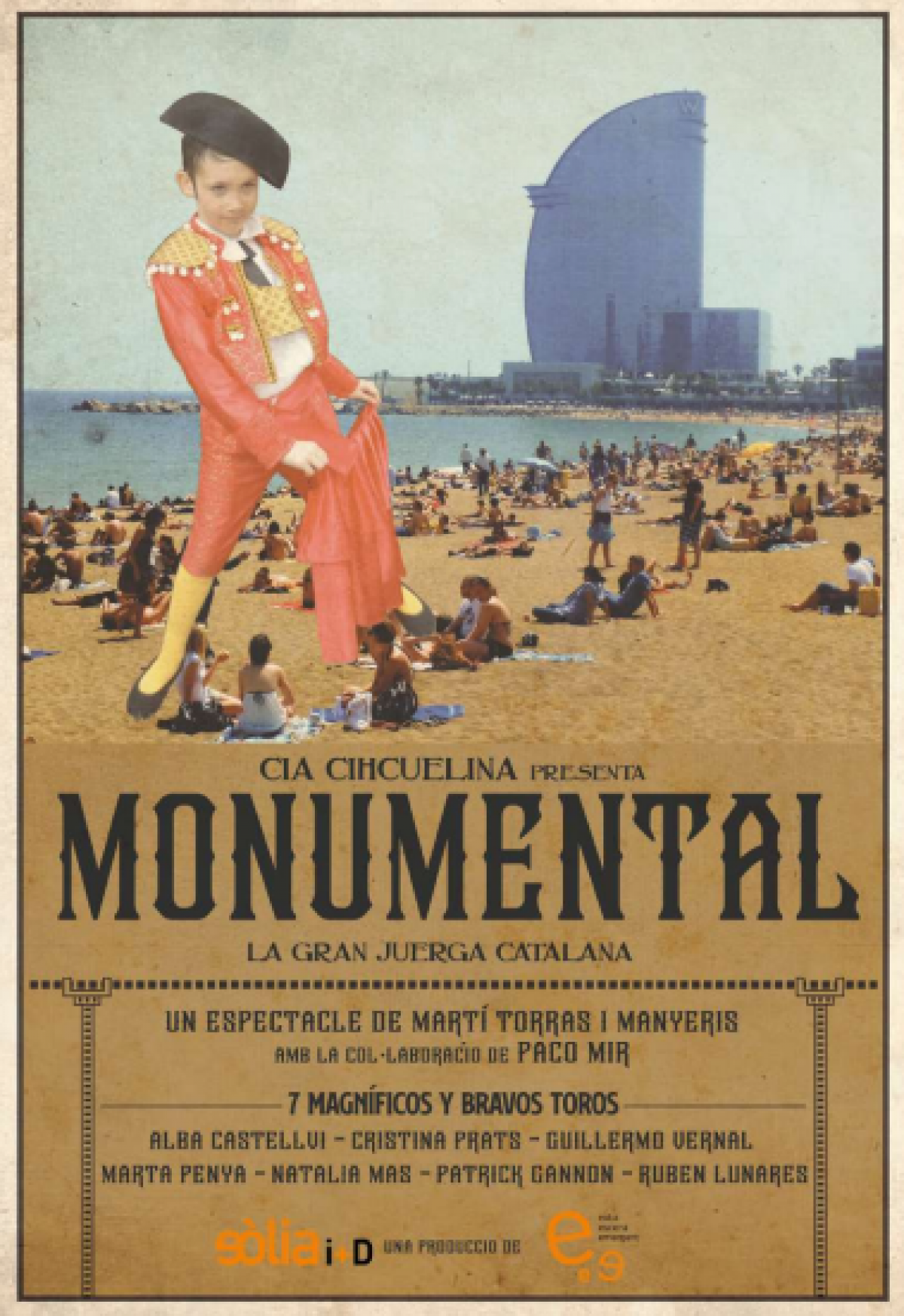 Torras, que ha contado con la colaboración de Paco Mir, ha utilizado como punto de partida la prohibición de corridas de toros acordada por el parlamento autonómico catalán en 2012, interdicto que dejó sin su principal función a la plaza Monumental. Desde entonces se ha debatido una y otra vez qué uso darle a esta construcción cuyo valor artístico nadie pone en tela de juicio y hasta se lanzó la idea de convertirla ¡en mezquita”. Torras propone otro uso imaginativo: transformarla en nuevo equipamiento del Teatre Nacional de Catalunya, proyecto que habría de dar lugar a un acto de presentación celebrado conjuntamente por la Generalidad y el Ayuntamiento y que, como tantos otros, caería rápidamente en el olvido. A partir de ahí surge una narración dramática que discurre por itinerarios cada vez más desmadrados y desopilantes próximos al absurdo con el fin, bien evidente, de hacer reír al respetable y, sobre todo, de poner en solfa muchos estereotipos de endeble contextura intelectual. La ejecución actoral de los siete intérpretes resulta sobresaliente -¡cáspita! ya se me ha colado un término taurino- no solo por la agilidad y desparpajo con que me mueven por el ruedo, apareciendo y desapareciendo una y otra vez con diligencia, sino además porque cada uno de ellos dobla, cuando no triplica, personajes, cada cual con su adecuada vestimenta, en un ejercicio de esforzado y sorprendente funambulismo.