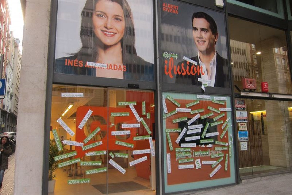 Los activistas han cubierto este lunes las fachadas de los locales con pegatinas en las que se lee 'Este partido no apoya las 5 de la PAH', y han coreado: "Dicen que no caben pero las vamos a meter".
