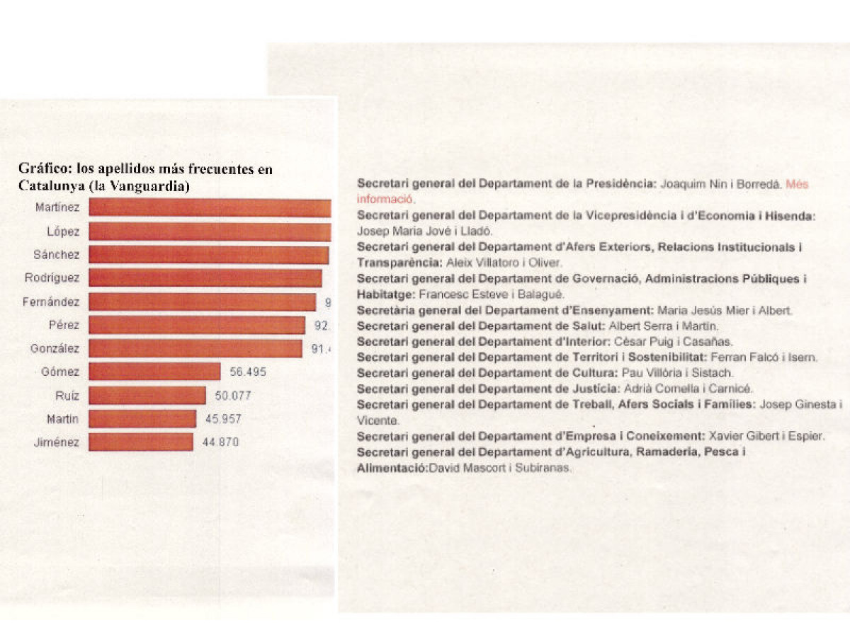 Y ustedes dirán: ¿qué hay de malo en esto? Nada, claro, no hay nada de malo en ser catalán, ni en tener apellidos catalanes, pero resulta cuanto menos preocupante que así sea, teniendo en cuenta este gráfico de 'La Vanguardia', publicado en febrero del año pasado, que reflejaba que los apellidos más frecuentes en Catalunya eran, por este orden, los siguientes: Martínez, López, Sánchez, Rodríguez, Fernández, Pérez, González, Gómez, Ruíz, Martín y Jiménez.