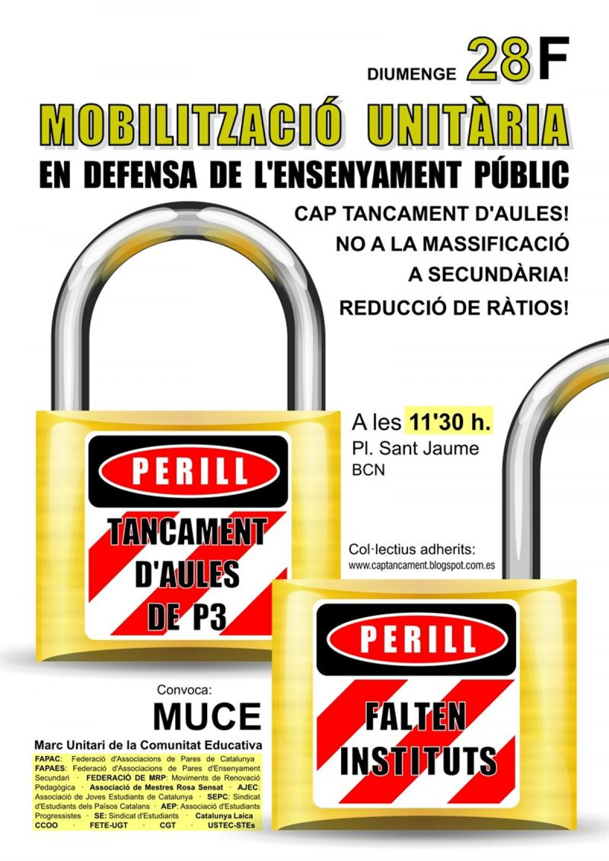 El Marco Unitario de la Comunidad Educativa (Muce), ha convocado una movilización unitaria en defensa de la educación pública, la reducción de ratios y contra la masificación en Secundaria este domingo en la plaza Sant Jaume.
