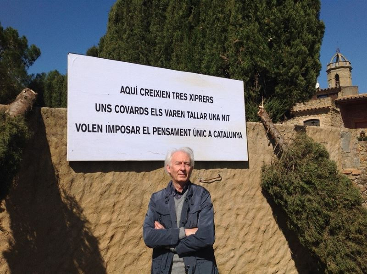 "Aquí crecían tres cipreses. Unos cobardes los cortaron una noche. Quieren imponer el pensamiento único en Catalunya", reza el cartel colocado por Boadella en el exterior de su casa.