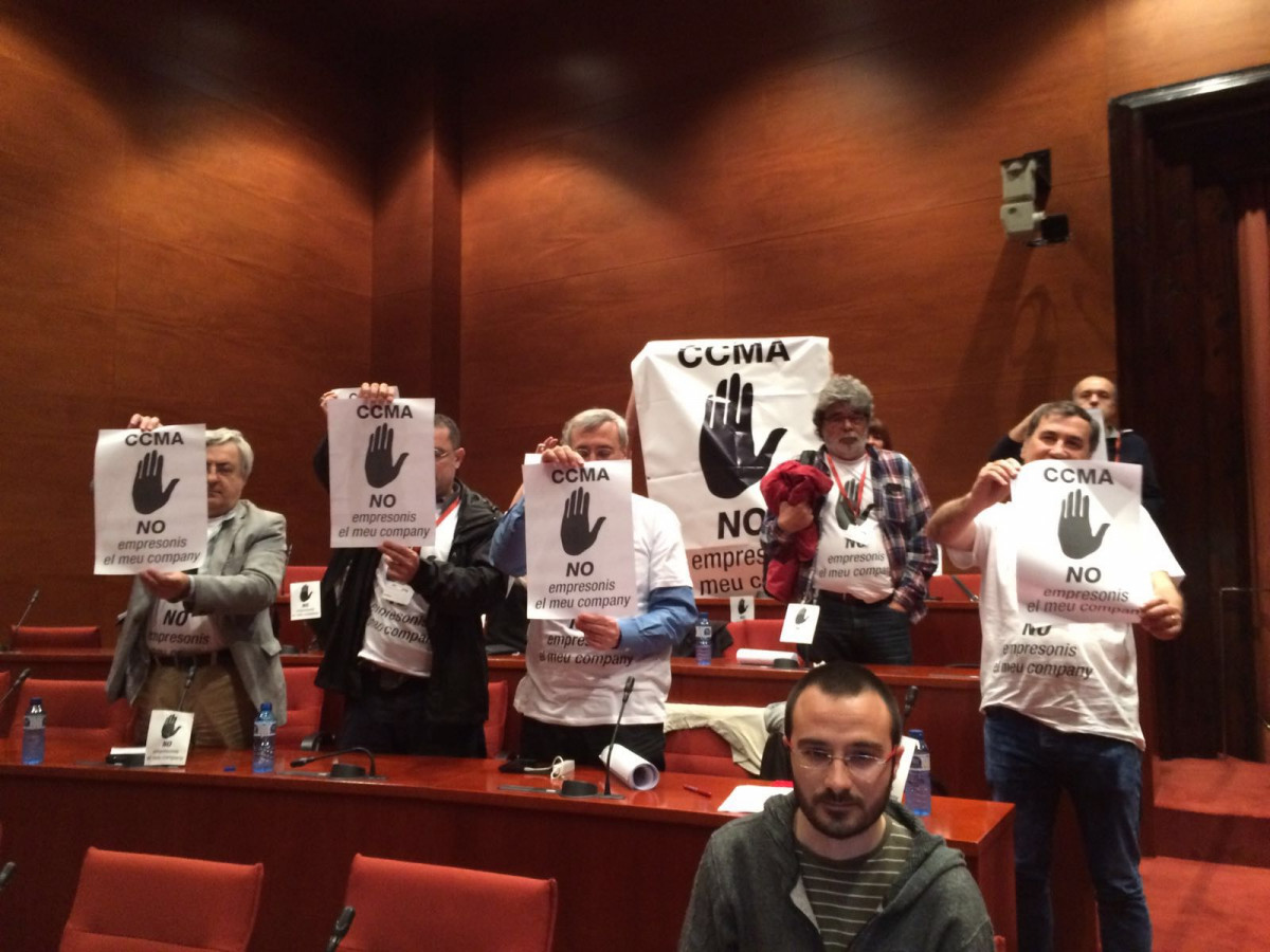 Trabajadores de TV3 protestan en la comisión de control de la CCMA contra la demanda de prisión a un compañero