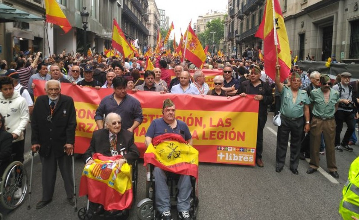 La manifestación ha transcurrido por Via Laietana, con los lemas 'Con la Constitución, las fuerzas armadas y la legión' y 'Orgullo, admiración y respeto', y los cánticos 'Viva España', 'Todo por la patria' y 'España, unida, jamás será vencida', entre otros. A pesar del lema, se han podido ver banderas con simbología fascista y preconstitucional.