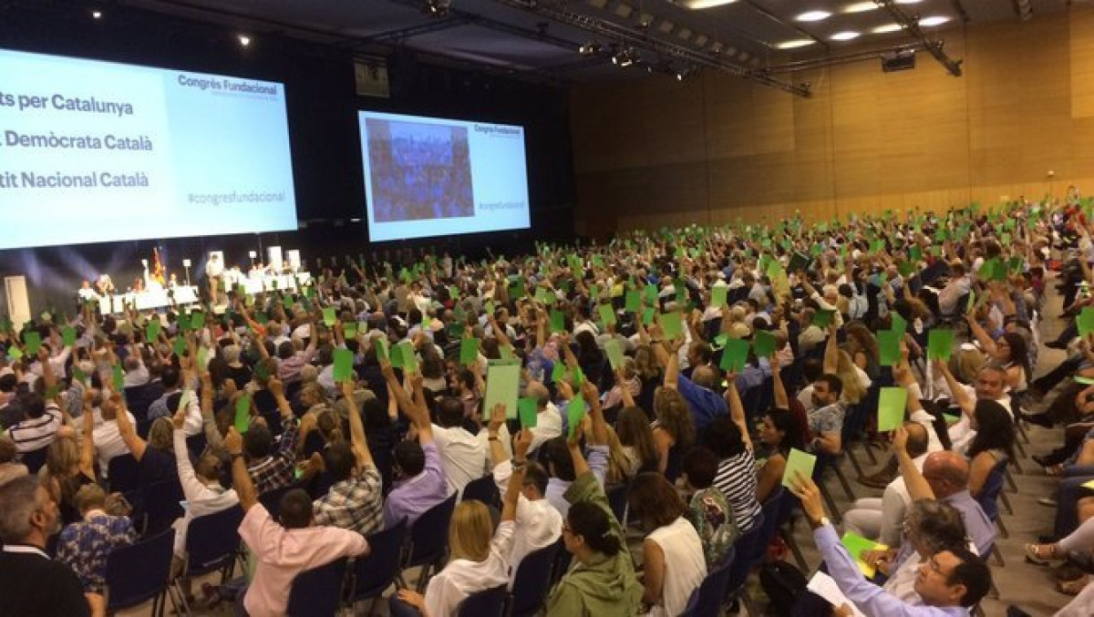 Los asociados de la nueva formación en una votación a mano alzada en el último día de Congreso fundacional, 48 horas después de lo esperado han tenido que elegir entre tres propuestas: Junts per Catalunya, Partit Nacional Catalá y Partit Demócrata Catalá.