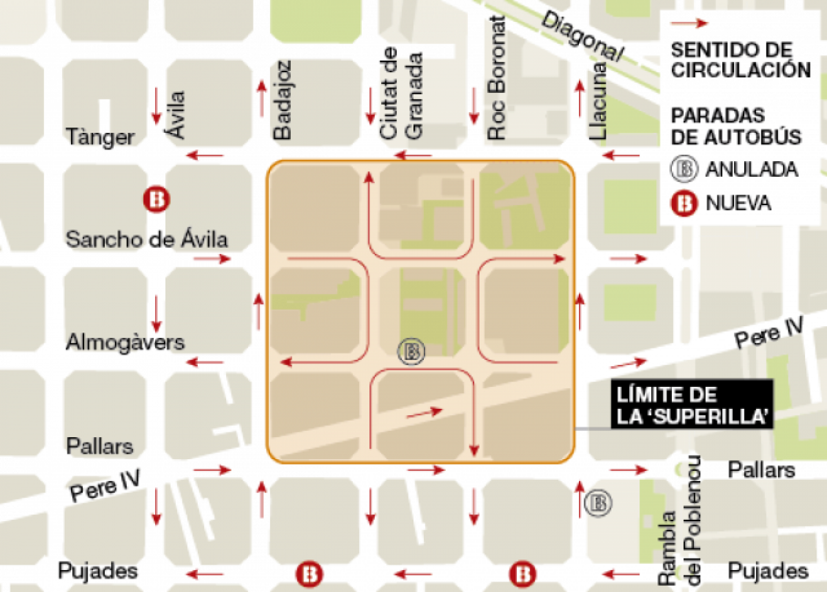 Esta primera supermanzana se pone a prueba en una zona con poca densidad de vecinos, con muchas empresas, la mayoría tecnológicas, y calles que no tienen un gran volumen de tráfico. Las paradas de autobús que había dentro de la supermanzana se trasladan a las calles perimetrales como el de Pujades.